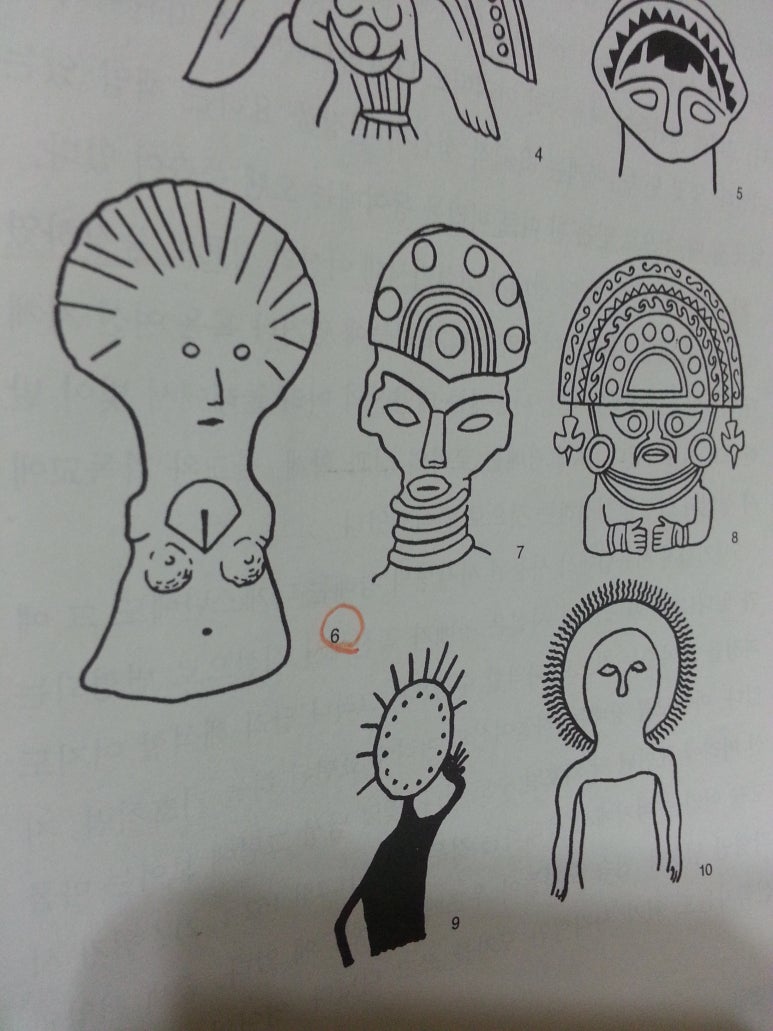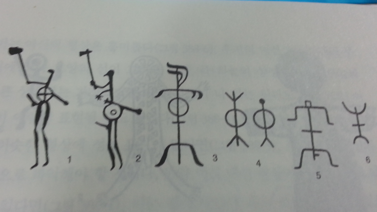 상기 그림 6번(북러시아) 및 그 곁의 7번(이탈리아) 그림은 머리대신 원판이 있는데.. 두개의 선.. 또는 점..이 묘사되어 있다. 청동기 시대 이전의 유물이므로...원판은 태양이 아니라..하늘(또는 하늘여신)을 상징하는것이다.. 원판 둘레에 있는 여러개의선...점..은 신석기 시대에서는 원판이 하늘(하늘여신)이므로.. 빗줄기..이다.. 헌데..청동기 시대 이후의 유물이라면 원판은 태양..이므로.. 선..점..은 광선..을 상징한다..그림 2번은 남성성기가 표현되어있다.. 시대관계없이 머리의 원판은 태양을 상징한다.