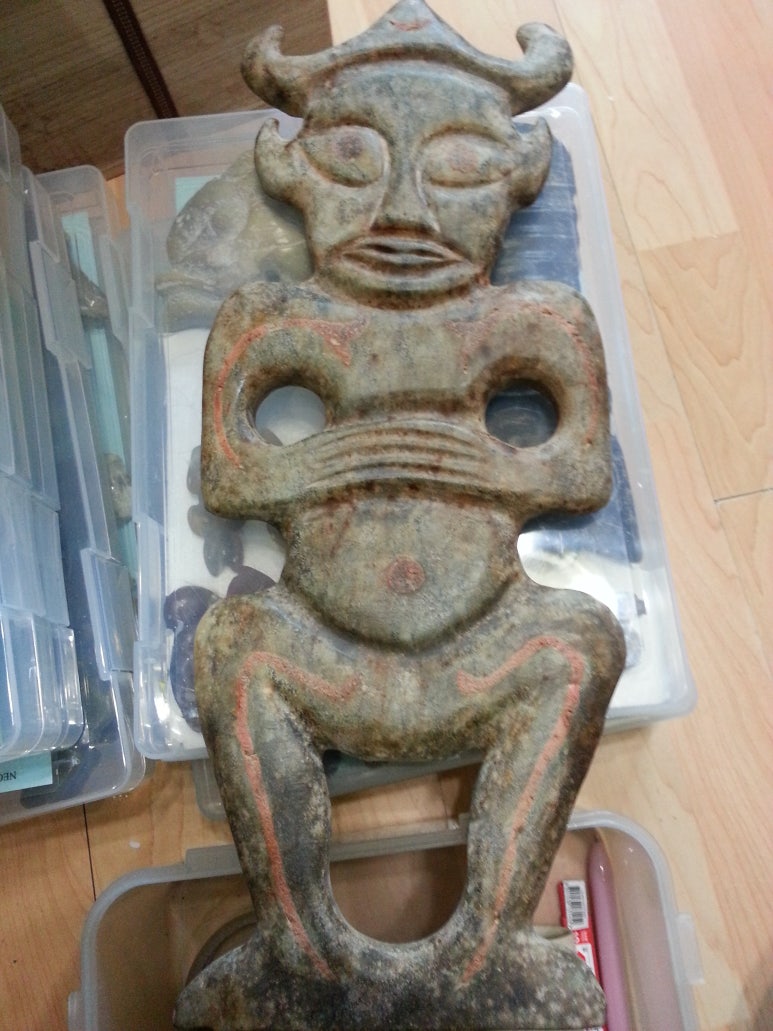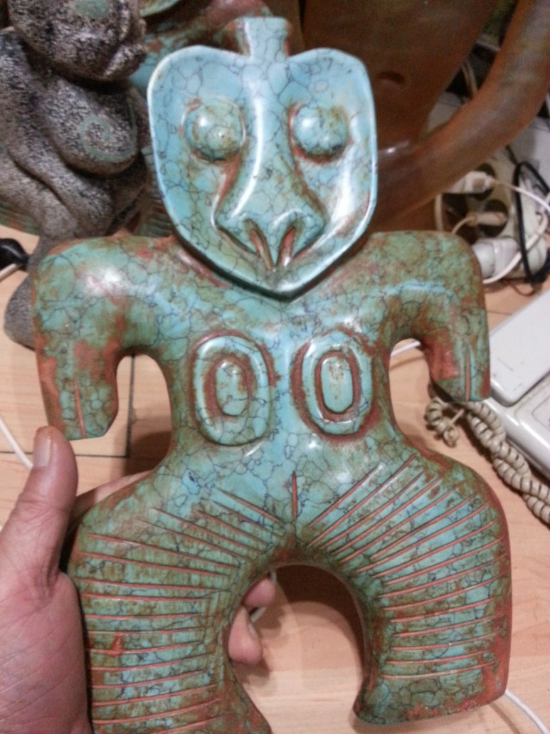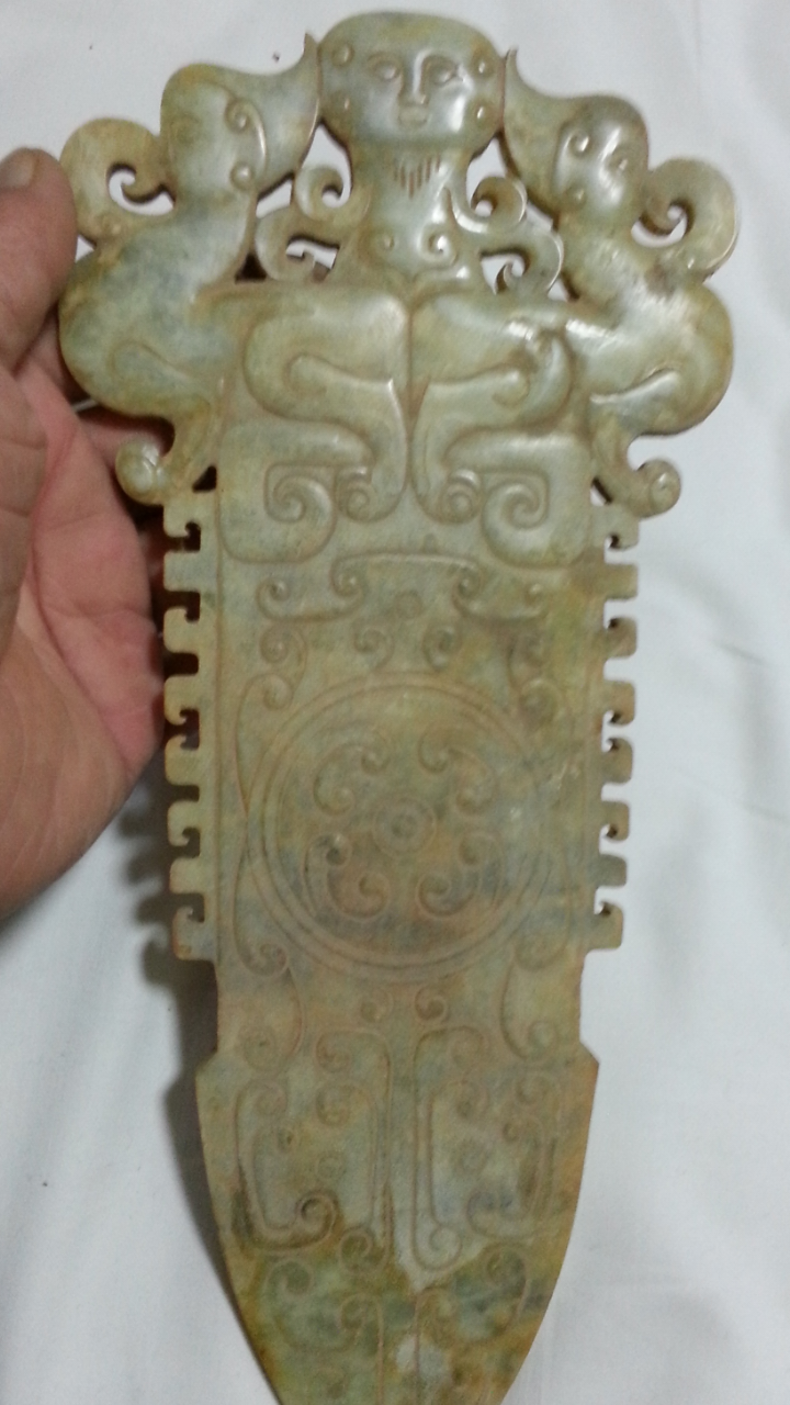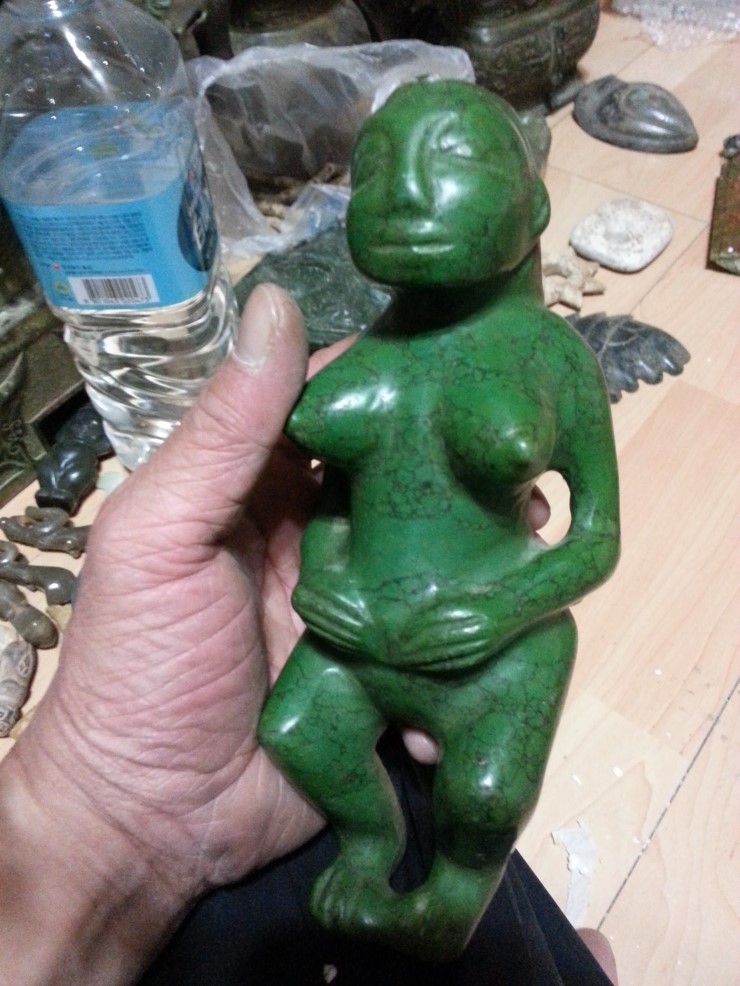 양손에 용을 쥐고 있는 통천인으로서.. 나는 전국시대.. 출토 진품..이라고 평가했다. 머리 좌우에는 소뿔(양뿔..사슴뿔)이 있으며.. 머리 중앙에서는 생명나무가 뻗어올라가는 형상을 표현했다.. 기마자세로 쪼그리고 앉아있다.. 만약.. 진품이라면 매우 희귀한 유물을 우연하게 입수한 것이다.. 중국 판매자 상점 에서도 몇달에 걸쳐서비싸게 부르면서 팔지 않던 것을 금번에 빼앗아오다 싶이.. 들고 나온 것이라 말한다.