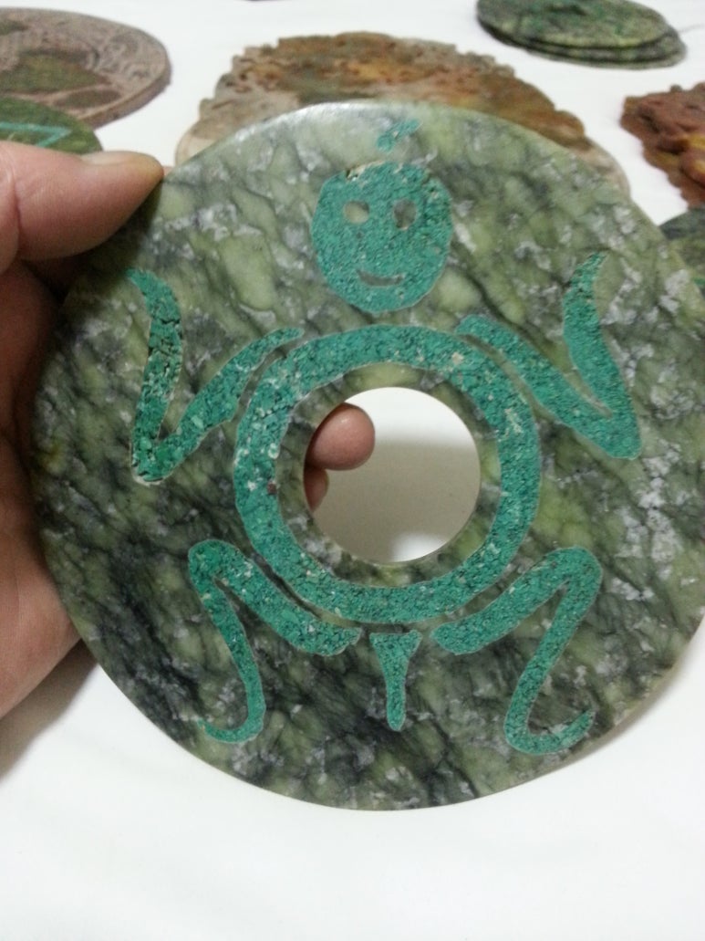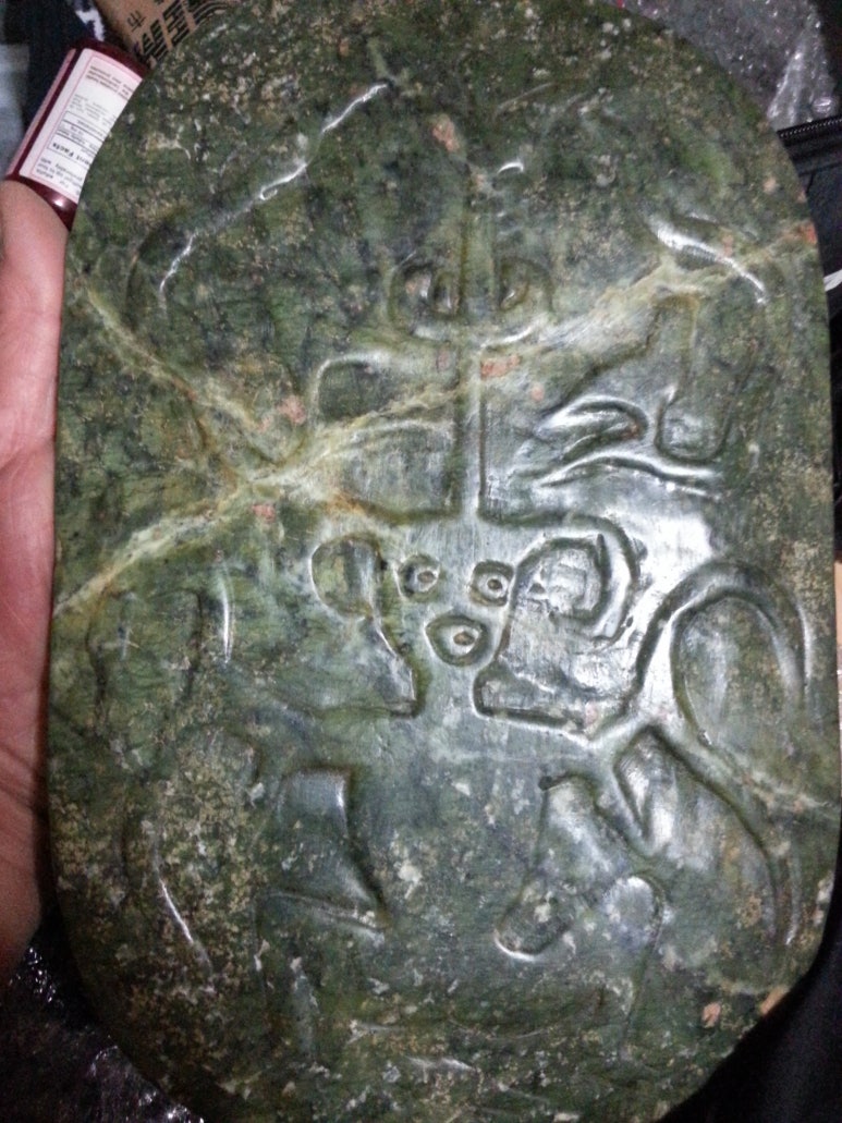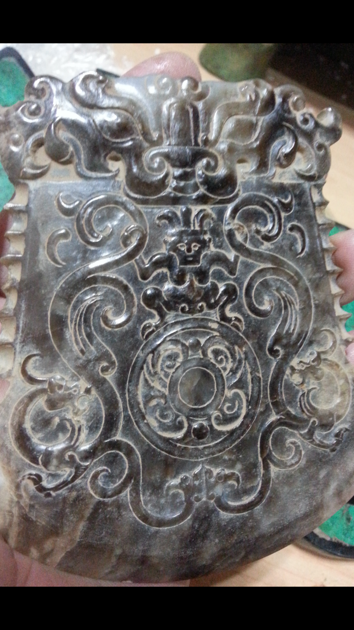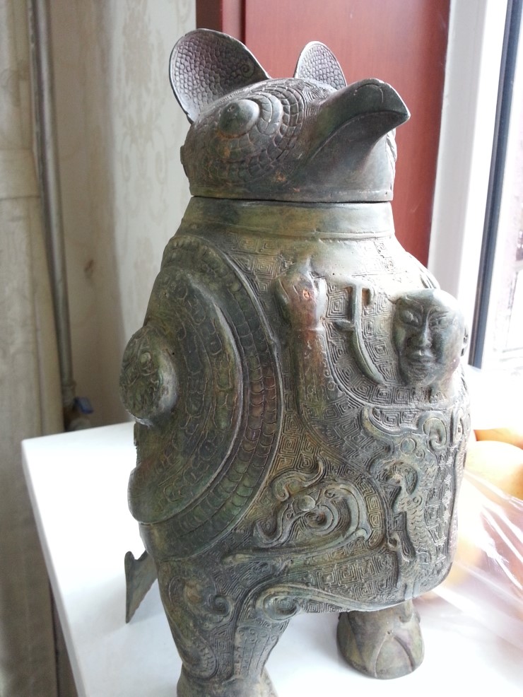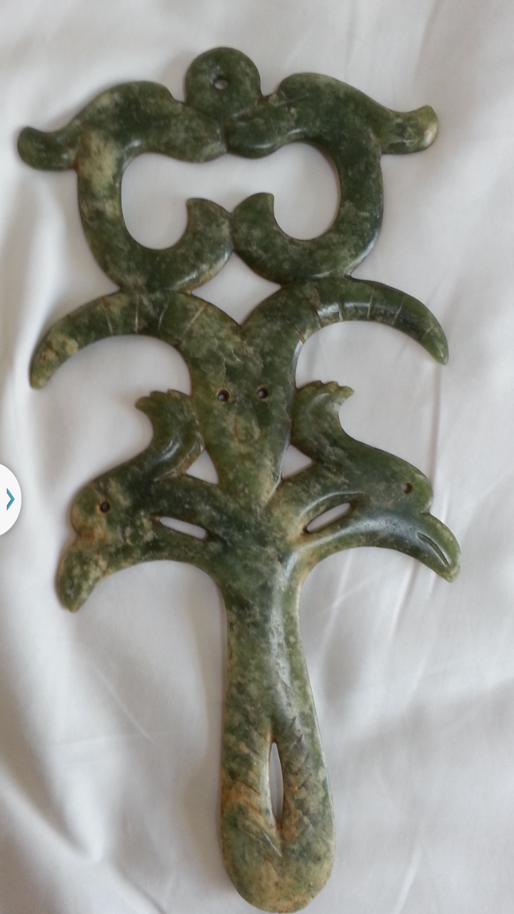 양손에 용을 쥐고 있는 통천인으로서.. 나는 전국시대.. 출토 진품..이라고 평가했다. 머리 좌우에는 소뿔(양뿔..사슴뿔)이 있으며.. 머리 중앙에서는 생명나무가 뻗어올라가는 형상을 표현했다.. 기마자세로 쪼그리고 앉아있다.. 만약.. 진품이라면 매우 희귀한 유물을 우연하게 입수한 것이다.. 중국 판매자 상점 에서도 몇달에 걸쳐서비싸게 부르면서 팔지 않던 것을 금번에 빼앗아오다 싶이.. 들고 나온 것이라 말한다.