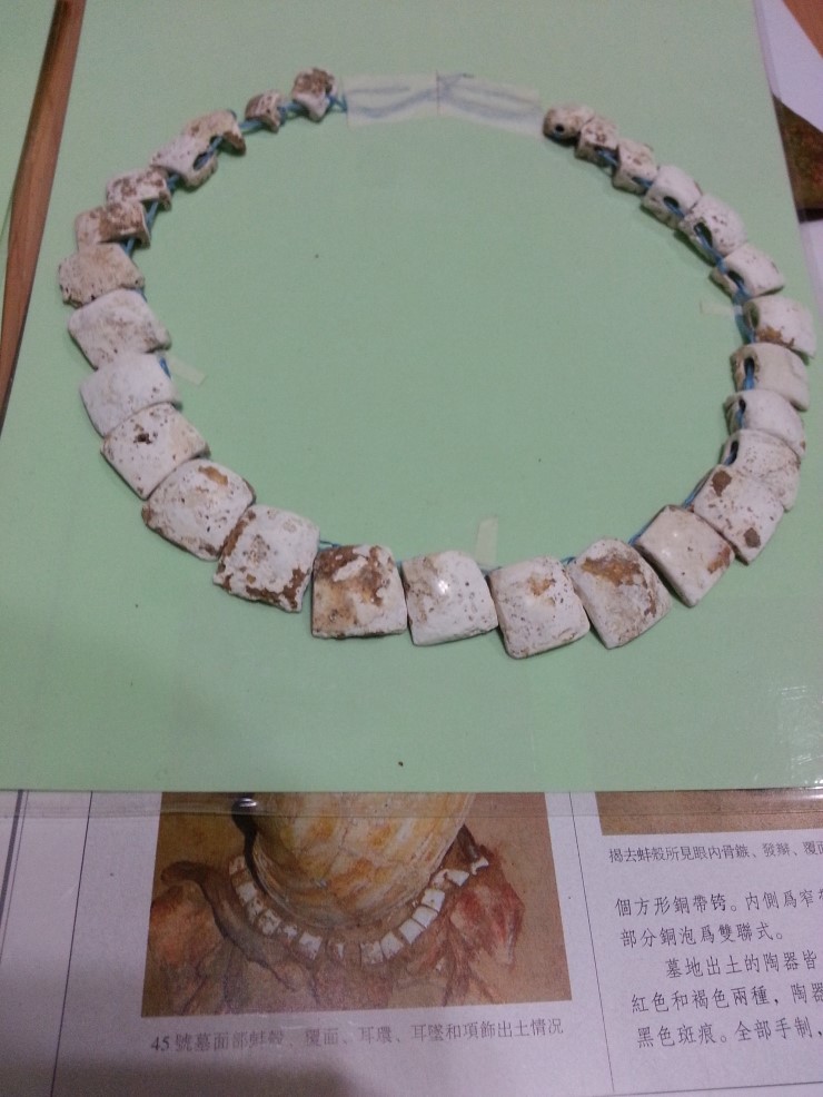 조개껍질이 아니라 백옥으로 만들어진 목걸이 인데.. 원래는 광택이 번쩍 나는 것이었지만..( 정중앙 하단의 알갱이는 광택이 남아있다). 대부분 백옥 표면이 마모 부식되어 광택이 모두 사라져 버렸다.