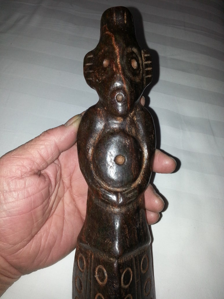<5> 아래 사진의 유물은 확실히 해석해낼 수 있는 희귀 유물이다.. 5-1.. 눈은 이중 원판으로 표현했다.. (하늘여신의 관장하는 하늘표시..이다.) 5-2.. 입 표현 또한 이중 원판이다.. (하늘의 표시이다..) 5-3.. 가슴에는 원판 과녁을 들고 있다.. (과녁판을 여성심볼의 표시이기도 하며 정중앙의 파인 구멍 또한 족보있는 상징성이다.. 회임을 은근히 표현하고 있다. 여하튼 회임을 주관하는 생명의 신(神)이시기도 하다.. 5-4.. 치미자락 문양도 온통 원판이며.. 이는 하늘의 상징이다. 5-5.. 결론적으로 이 유물은 2만년 족보를 자랑하는 하늘여신의 모습..이다. <주> 상투를 하고 있는 것인지.. 관모를 쓰고 있는지는 불분명하다..