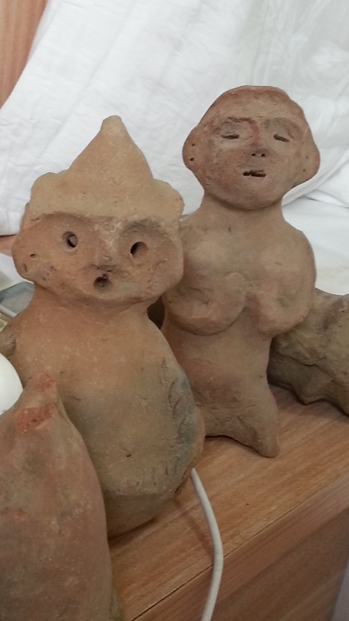 <1> 중앙의 네명의 자세를 살피면.. 1번..3번.. 사람이 2번 사람을 붙잡고 있다.즉 사냥에 앞서 두명의 남자가 한명의 여자(2번)를 두고 서로 다투고 있는 모습이다.특히 1번 남자는 성기가 발기된 상태이다.<2> 이 같은 사실에서.. 라스코 동굴벽화와 탄자니아 암채화는 공통된 상징성을표현하고 있다.. <3> 즉.. 하늘여신과 그녀의 권능을 받은 여성들은 성공적인 사냥에 있어서 주술적인 효능이 있다고 믿었었다.. 그리고 사냥 나가는 남성들은 그 여성의 주술적 힘을 받으면 성공적인 사냥을 거둘 수 있다고 생각했다.. 그 힘을 받는방법은 남녀 교합 행위이다..<4> 두 남자가 다투는 행위는.. 자기가 성공적인 사냥의 주역이 되고자 했음을 나타낸다.. 또는 자기가 우선적으로 주술적인 힘을 받아서 사냥에서 다치지 않도록 하겠다는 뜻이다. +++++ 남성들이 사냥을 나간 사이에 (가령 6박7일) 여성들은 무엇을 하는가.!?주술적인 힘을 계속 발휘시킨다.. 자기 스스로 만은 자신의 모습을 보면서계속 주술적인 힘을 발휘한다. 아래의 토제 여성상은 두손을 가슴에 얹고있는데.. 이는 하늘여신으로부터 권능을 부여받음에 대한 숭배(감사)하는자세이다.. 이를 통하여 기도를 한다. <주> 나는 고등학교 3년 동안진흙을 빚는 취미활동반에 가입했었다. 조각칼 던져서 과녁맞추는 것은 3년간 훈련으로 솜씨가 있다. 놀라운 사실이란.. 가장 먼저 진흙을 빚어사람얼굴상을 만들면.. 누구나 모두 마찬가지로.. 자기 얼굴을 만들어낸다.아래 진흙 조각상도 만든 여성의 얼굴이 가장 가깝게 표현되어진 것이리라..