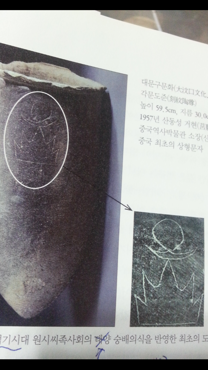 가장 대표적인 예를 들어보자.. 6천년전 토기위에 새겨진 문자소를 해..달..산..으로 해석하기도 하는데.. 6천년전에는 해..는 중요치 않았다.원반은 하늘을 상징하며.. 이는 곧.. 하늘여신의 상징이며.. 그아래 원반 형태는수분이 모여있는 구름..을 표시한 것이며.. 이는 곧.. 하늘의 천장..이다.. 그곳 하늘의 천장으로부터.. 비가 쏟어지면서.. (빗살무늬).. 만물은 생명의 활기를찾는다.. 맨 아래의 왕성한 만물의 성장의 형태를 주목하자..게다가.. 이 토기는 물을 담던 용기이다.. 물은 하늘여성.. 그리고 여성성 토기이며..태양이라는 관념은 물담던 토기와는 어울리지 않는다.. 단.. 그러다가.. 4천년전 청동기 시대에 접어들면.. 그러한 관념이 뒤바뀌게 된다.