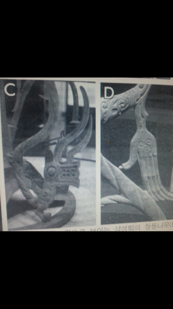 창세기의 선악과를 묘사하고 있는 것으로 보이는 삼성퇴 청동나무..는.. ‘신목 (divine tree)’ 으로 불리고 있다. 여기에는 그림 C..두 개의 뿔이 달린 큰 뱀(serpent).과 그림D..하와의 손(Eve's hand)이 묘사되어 있다..